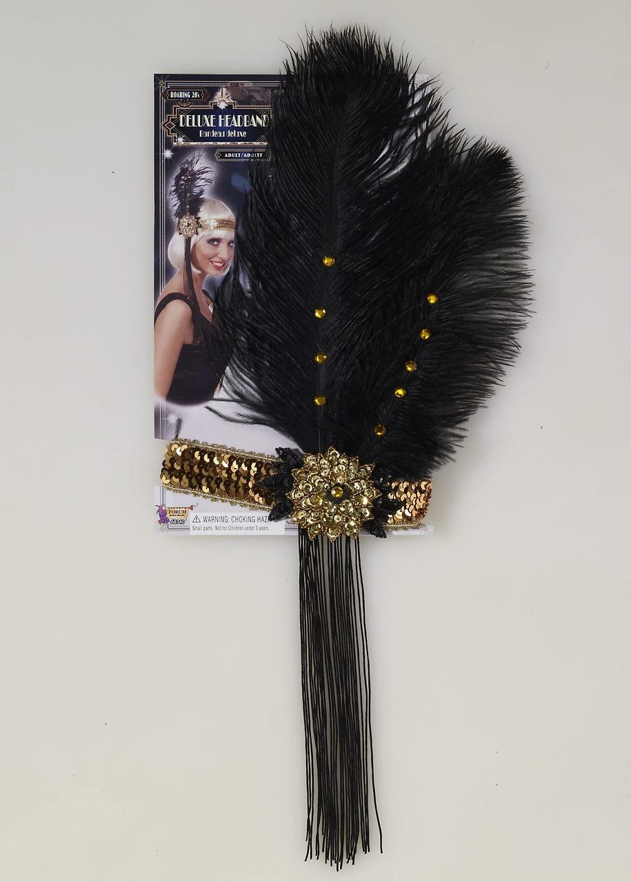 This stretchy gold sequin headband has a beautiful ornate jeweled piece that has black and gold sequins on it. There is a long tassels that flown down under the jewel and two big black feathers decorated with gold.