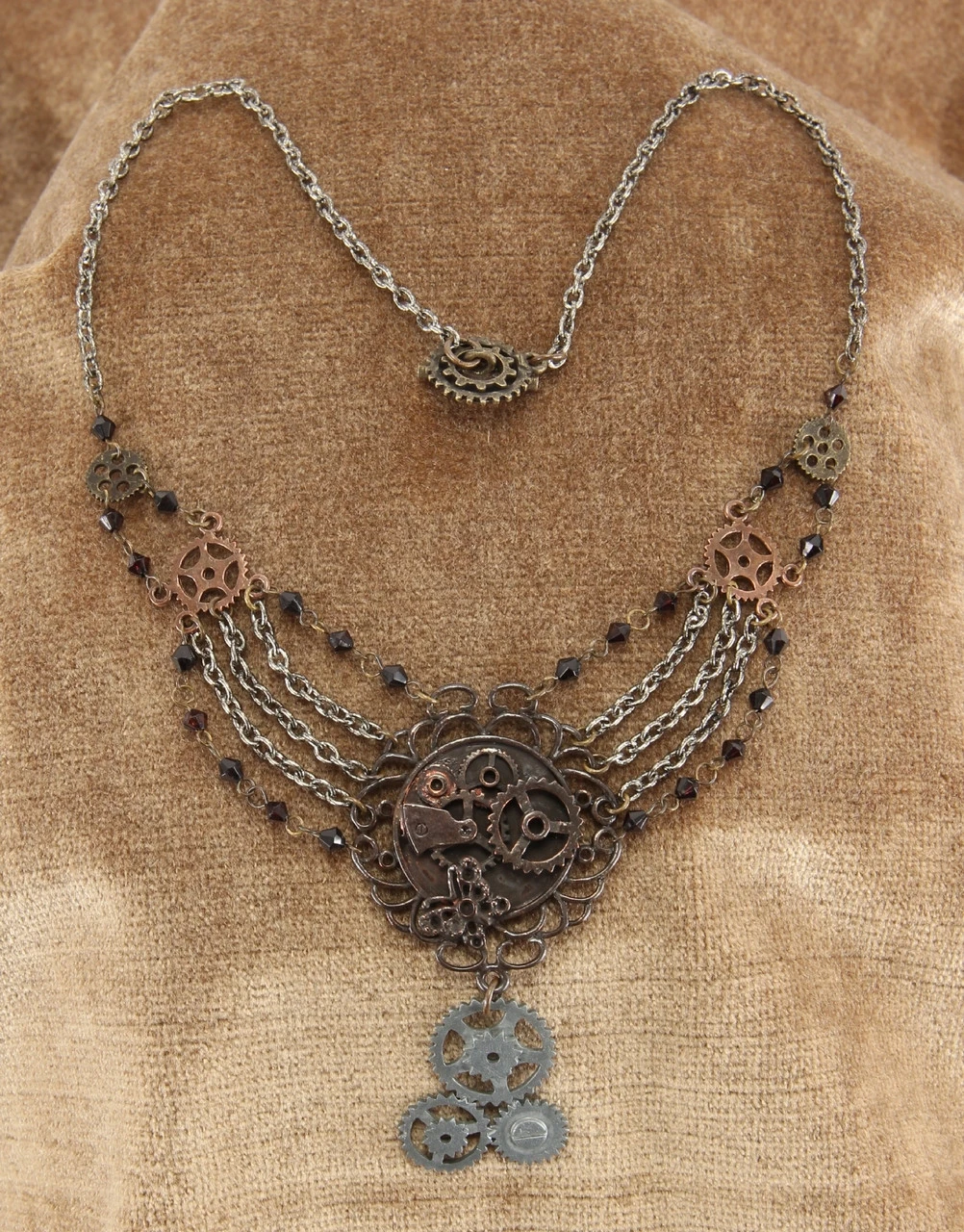This necklace is a nice mix of gears and beads to complete all sorts of Victorian era costumes. The necklace is a silver chain that splits onto layers of chains all attached to one bronze coloured gears set in a cameo setting. There is three silver gears hanging from the big bronze cameo. Add more steamworks steampunk accessories to complete the mechanical Victorian look. Great for Halloween or every day wear.