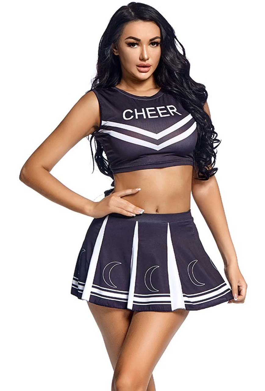 A gothic twist to the common preppy cheer uniform! Featuring a two-piece cheerleader outfit with a crop top and pleated skirt that has a crescent moon design on the hem. Also includes knee high socks and black pom poms to complete the look of this rebellious cheerleader costume for women.