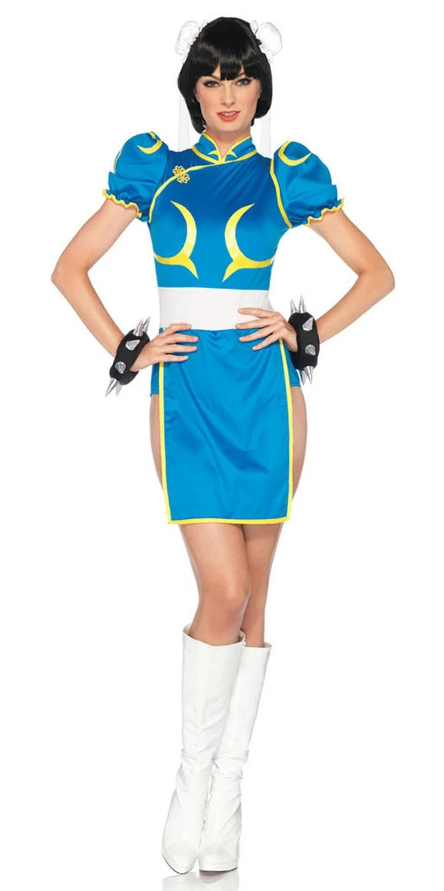 This is a sexy Chun Li costume from Street Fighter. This is a popular video game and anime character.