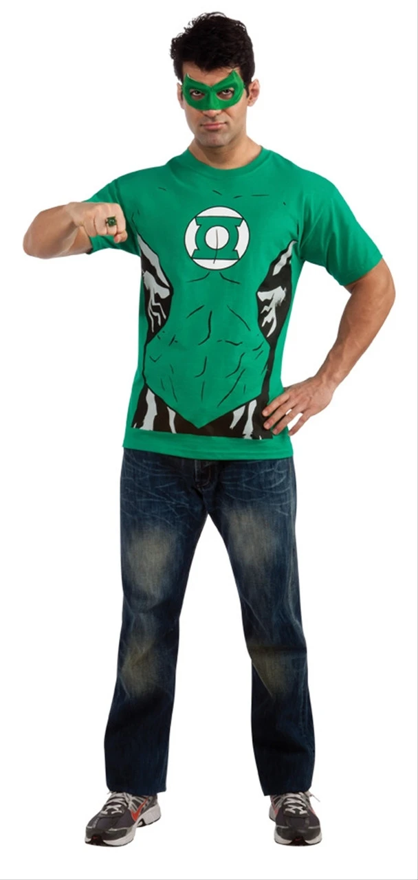 This costume kit has everything you need for an easy Halloween costume. This T-shirt is a comfortable cotton material with silk screened super hero muscle chest, and Green Lantern logo printed on the front. This Green Lantern guy has a mask and ring included. Great for a collector or Halloween.