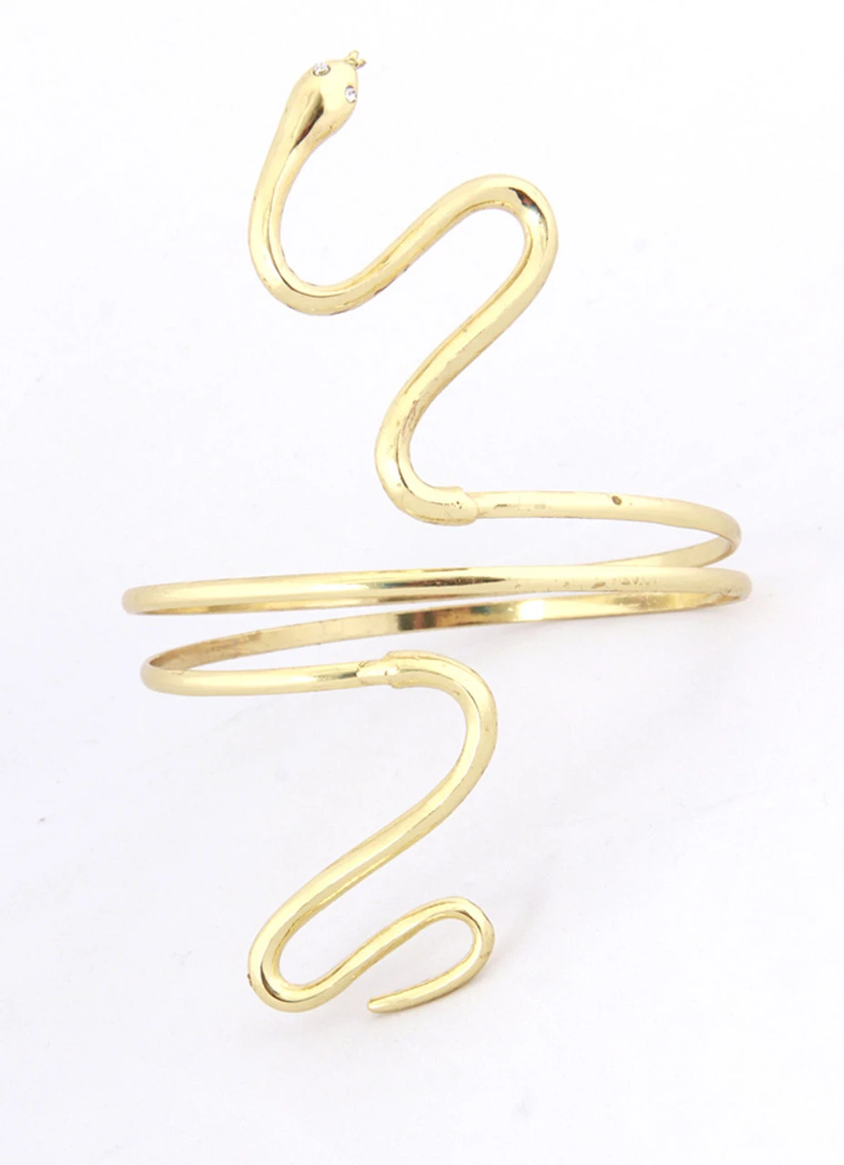 Whether you’re planning a trip down the Nile, or just walking like an Egyptian down your block, this Gold Egyptian Arm Bracelet by elope is for you. Add this armband to any Egyptian costume for a touch of asp authenticity. Made from zinc alloy and brass with plastic faux gem accents, this jewelry piece is semi-adjustable with gentle shaping.