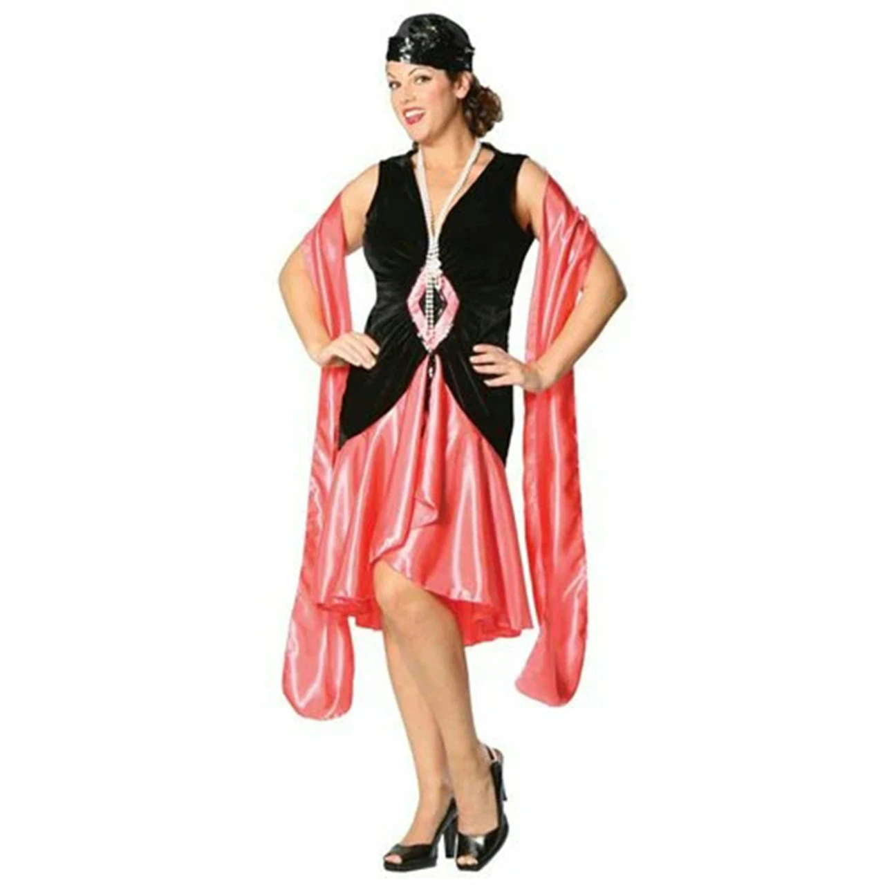 This costume includes the following items: Black and coral 20’s dress with sequin and cloche headdress