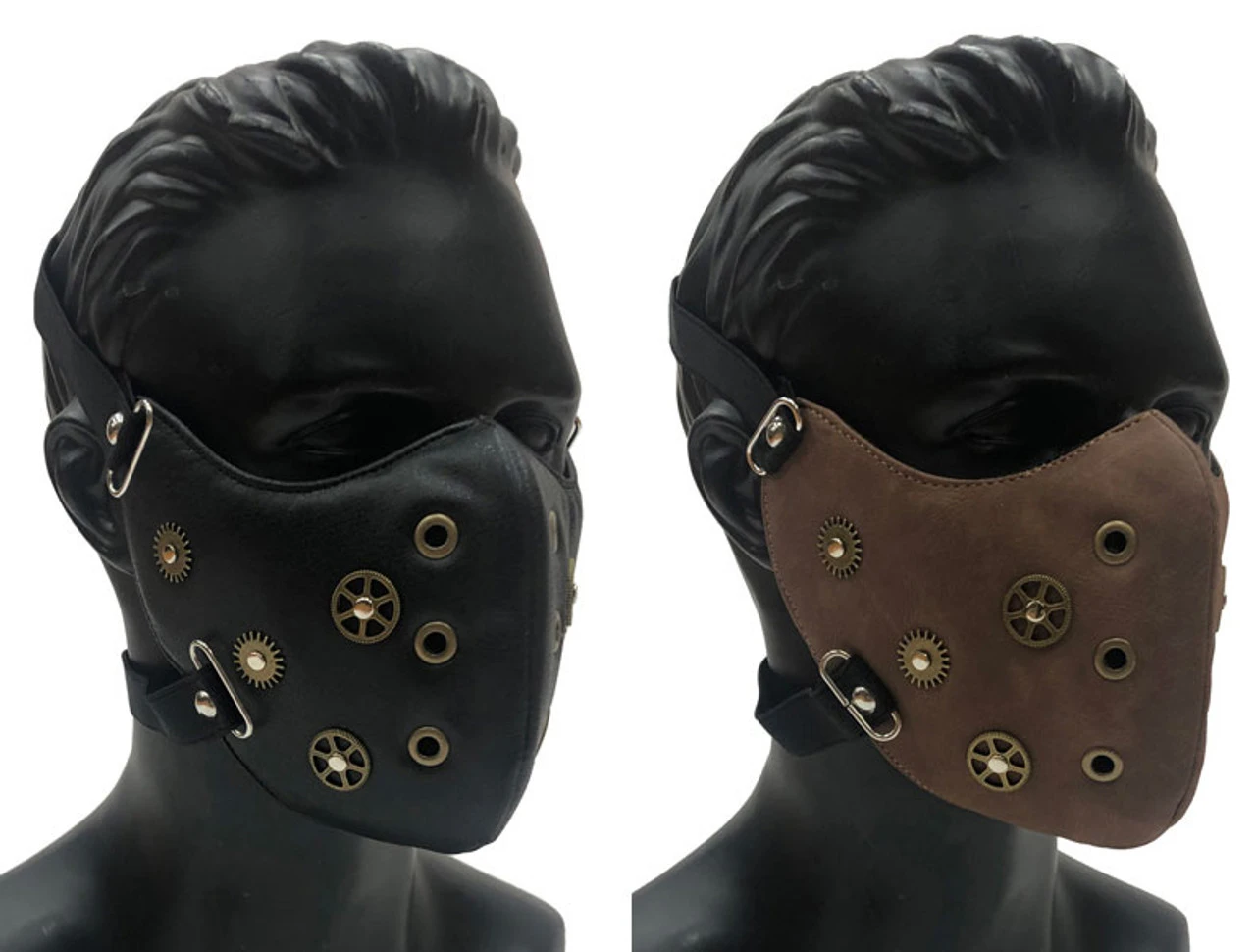 This black leather mask has gold breathing holes and gear studs for that steampunk affect. stretchy straps for comfort. Great for everyday use or a wonderful add on to your cosplay and costumes