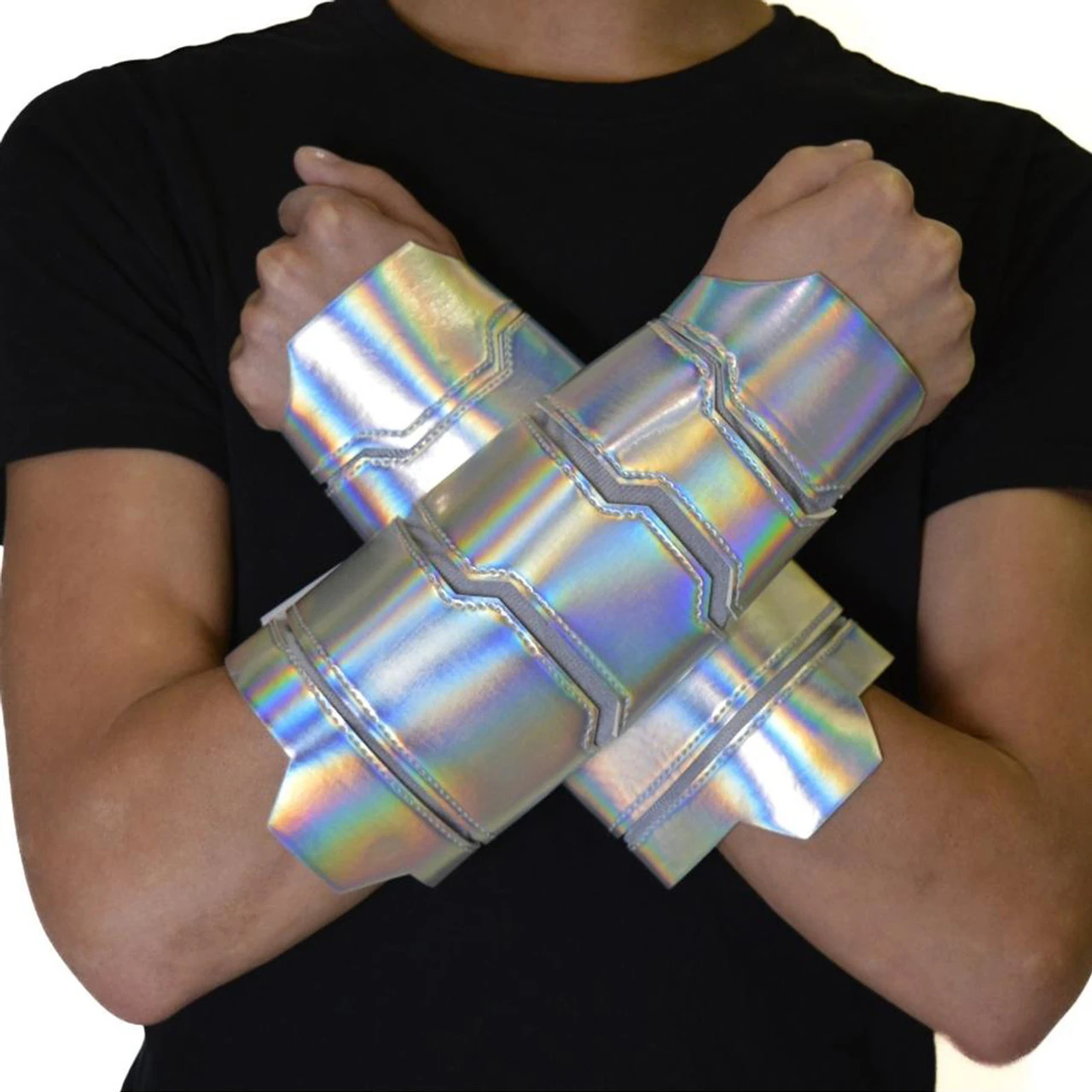Look no further! These leatherlike silver superhero cuffs are perfect for any superhero costume.