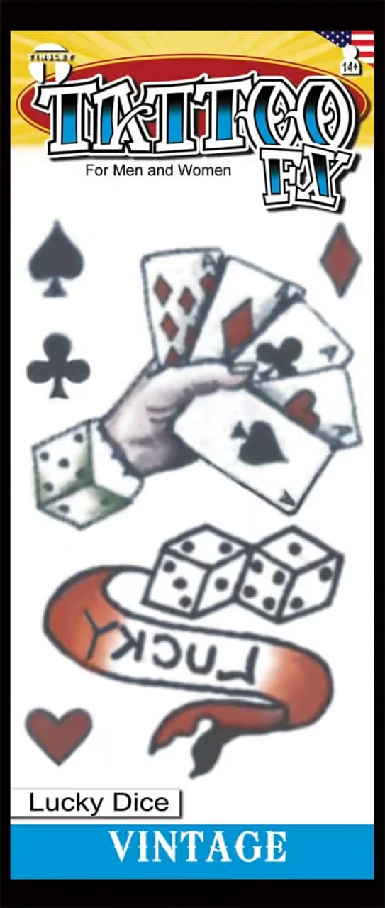 Ultra realistic “Lucky Dice Vintage Tattoo FX”. Applies with just water!