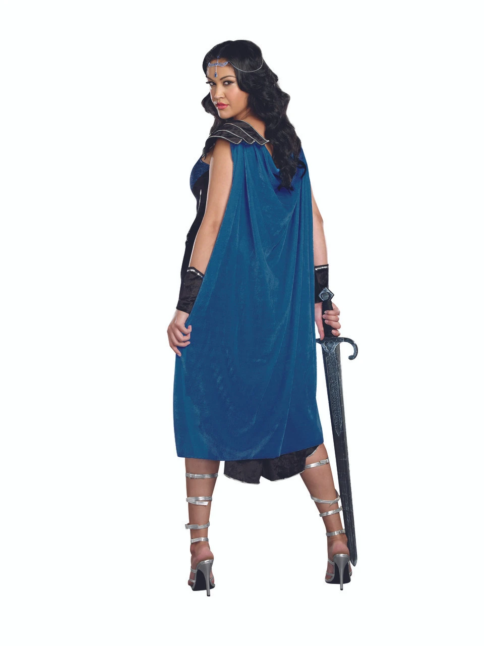 The King Slayer Knight costume includes a black velvet dress with blue and silver details. The black high low dress zips up in the back. The front panel of the dress is in a textured, shimmering blue fabric that looks like armour. On the bodice is a large Knight’s coat of arms with a silver lion. Attached to the dress is a black and silver belt with dark silver jewels embedded. The shimmering blue fabric continues into the skirt and is edged with silver sequins. The shoulders have layered black velvet shoulder guards and are lined with silver sequins. Attached to the dress at the shoulders is a dark blue velvet cape that is slightly longer than the dress. Included with the costume is a pair of black velvet wrist gauntlets lined with silver sequins. A blue rhinestone headpiece is also included with the costume to add that extra sparkle.