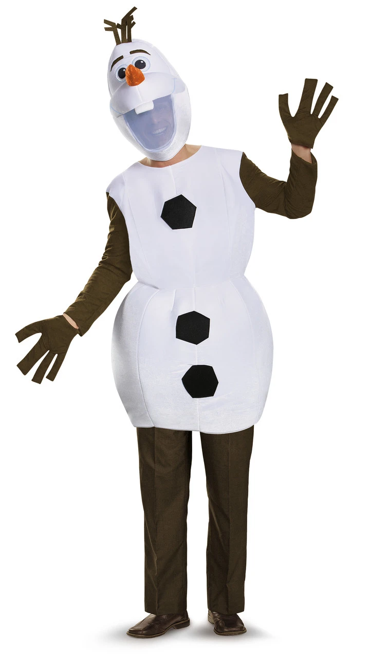 This Olaf costume is perfect for fans of the movie Frozen. The highlight of this costume is the Olaf headpiece. This plush poly-foam headpiece looks just like Olaf from the movies. It has a plush carrot nose and felt eyes, eyebrows, and hair. Your face sits inside Olaf’s wide grin with a light blue mesh hiding your face. The headpiece is quite comfortable and it is easy to see and breath through the mesh panel. The headpiece fastens in the back with Velcro. The poly-foam tunic is in the shape of two snowballs. It has three black felt value details on the front. The arms of the tunic are dark brown and textured to give the impression of wood. Matching brown gloves are included with the costume.