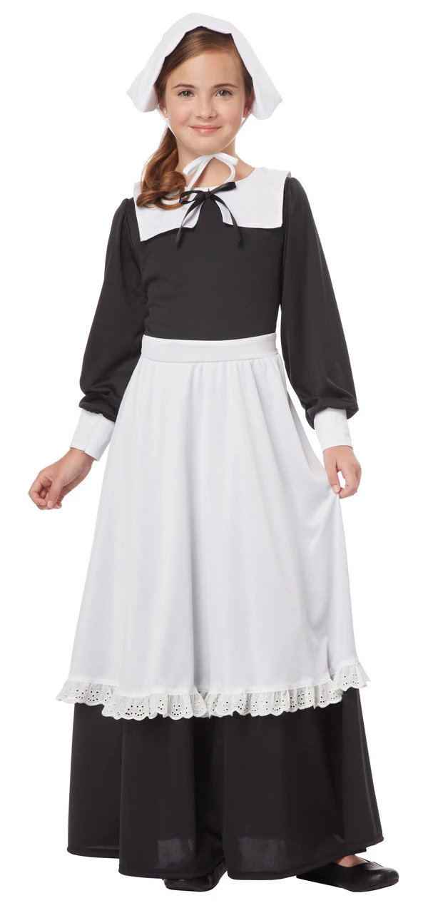 Wear this 18th Century Girls Pilgrim costume to a period costume or Thanksgiving party, Halloween, ‘American Girl’ themed event, Salem witch costume, or Fourth of July celebration etc.