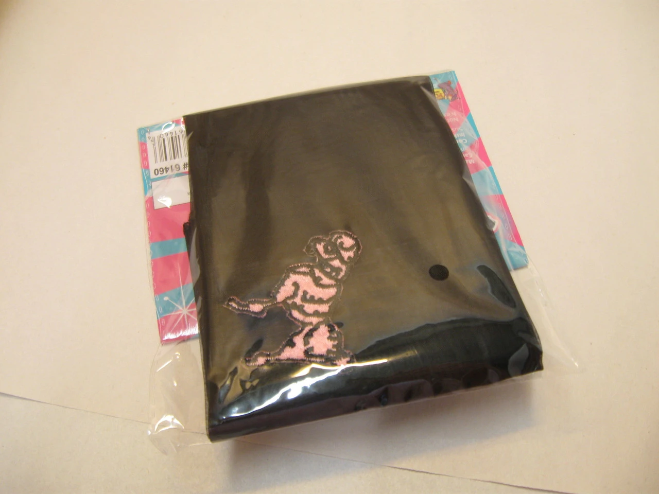 This sock hop scarf is the perfect addition to your poodle skirt. This poodle scarf is a soft retro see through material and comes in black, white and pink. The scarf has an embroidered poodle on one of the edges. This fancy accessory is great for all 50s costumes to wear in the hair or around the neck. Bring it to your next sock hop gathering and strap on your saddle shoes.