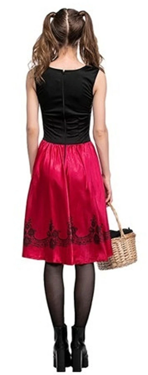Be careful in the woods, you might cross a mean and angry wolf! This cute Red Riding Hood costume for women includes the classic dress with a black velvet top, satin skirt with pretty designs printed on the hem and a red velvet hooded cape.