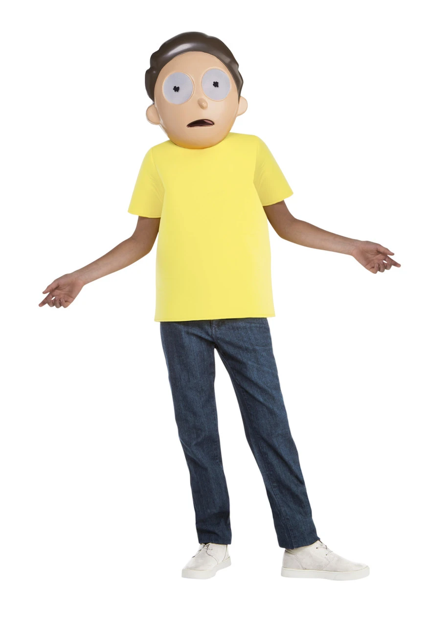 This Morty costume from the Rick & Morty show includes the recognizable yellow shirt that Morty wears, padded and shaped for character. Morty’s large, round, deeply concerned face is rendered in a deeply compelling vacuform mask, with mesh eyes to hide the wearer’s face while allowing excellent vision.