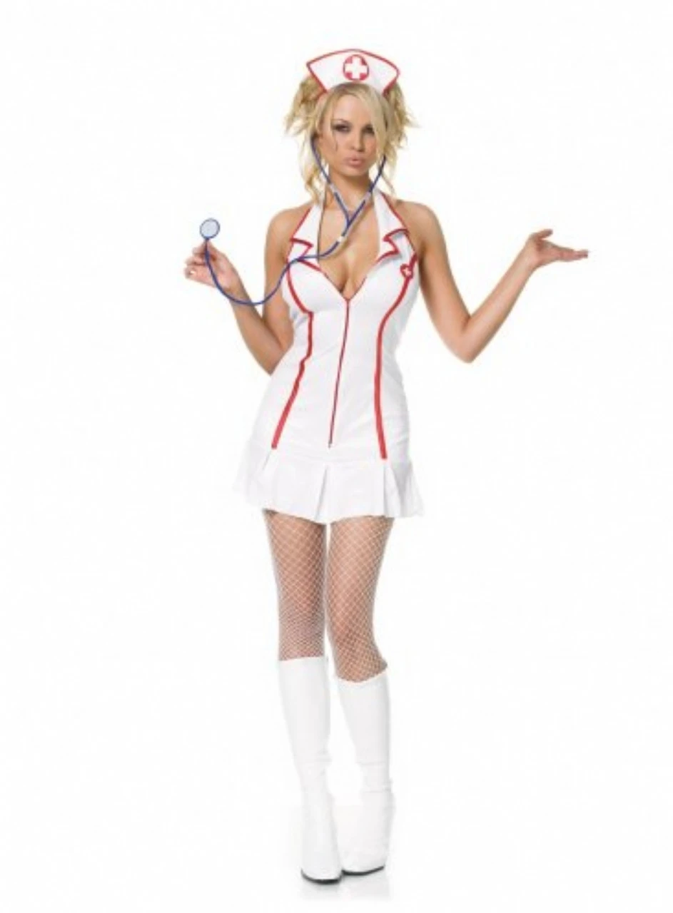 This Nurse costume features a very cute and sexy halter necked white dress with a red front zipper, so YOU decide how low cut you want it. There are also some very cute red accents that run along the collar and on either side of the dress for some very flattering lines. The skirt portion of the dress is pleated and as a warning, this dress is pretty short. This costume also includes a white headpiece that is on a head band and has a super cute little red cross on it. Lastly there is a little blue stethoscope to complete this great little outfit.