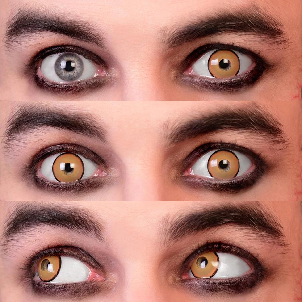 VILLAIN contact lenses features a very opaque gradient of bright yellow at the center that blends in with an orange hue and dark ring at the edge of the lens.