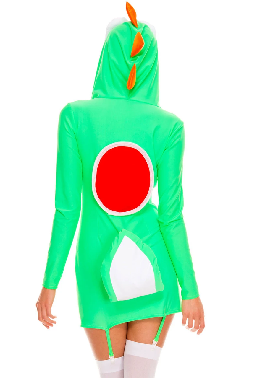 This one-piece Yoshi costume includes a dress. The dress has an attached dinosaur hood which features two large stuffed eyes and a line of stuffed dinosaur spike. The back of the dress features a stuffed red saddle and stuffed dinosaur tail. The dress is made of stretchy material, to achieve a sleek and form-fitting look and it does up in the front. The dress also features integrated garters, which are adorned with stuffed dinosaur eggs and green bows.